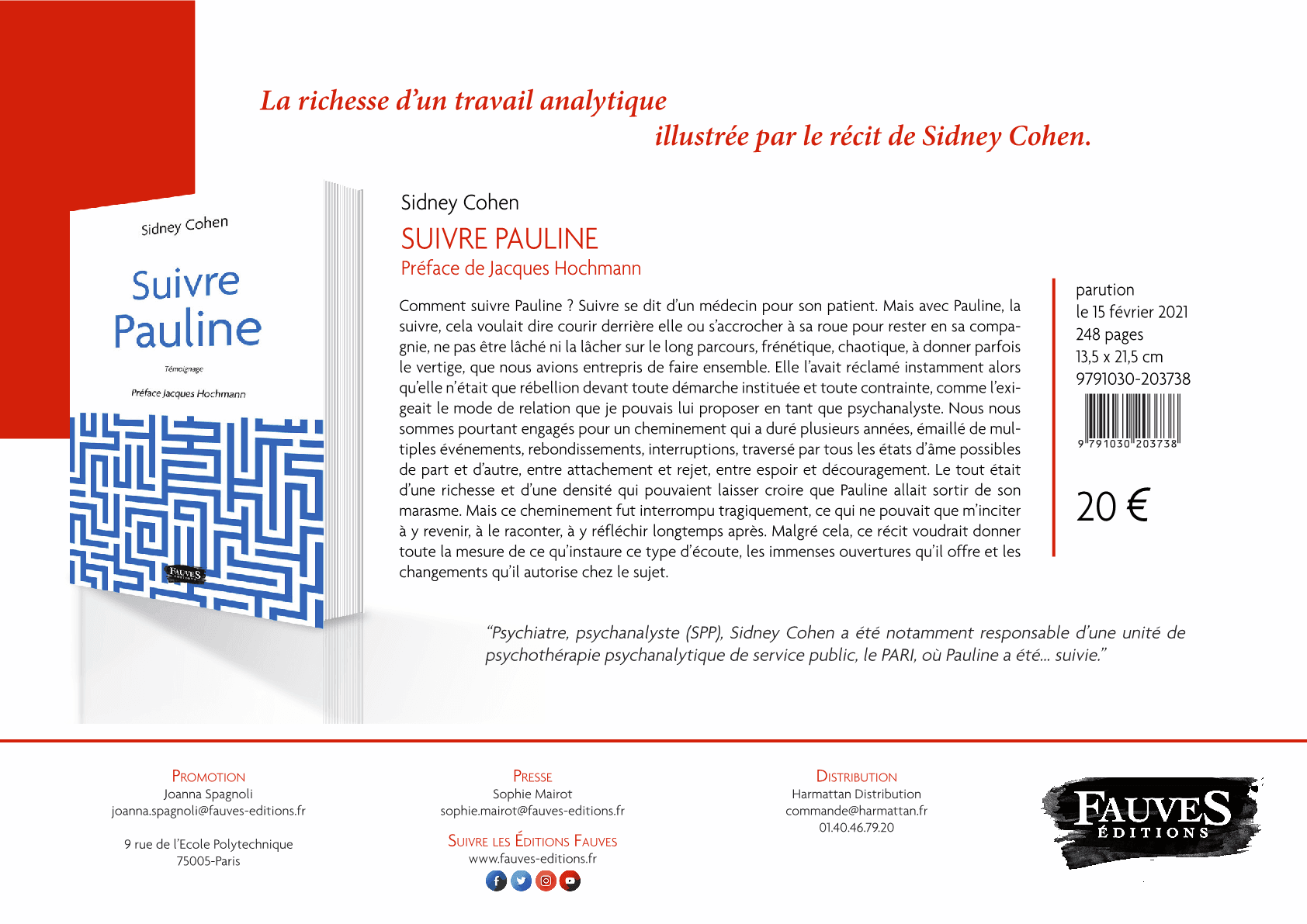 Suivre Pauline, tel est le titre du livre, au éditions Fauve. Sidney Cohen y dépeint, dans un style alerte, vivant, ce qu'a été cette longue aventure. S'il nous décrit bien les émotions et tourments par lesquels passent les deux protagonistes, Sidney nous épargne un jargon psychanalytique et des tics psychanalytiques, si bien que ce livre fait plonger sans obstacle de vocabulaire abscons, même les non initiés, au coeur de la relation et de l'engagement thérapeutique.