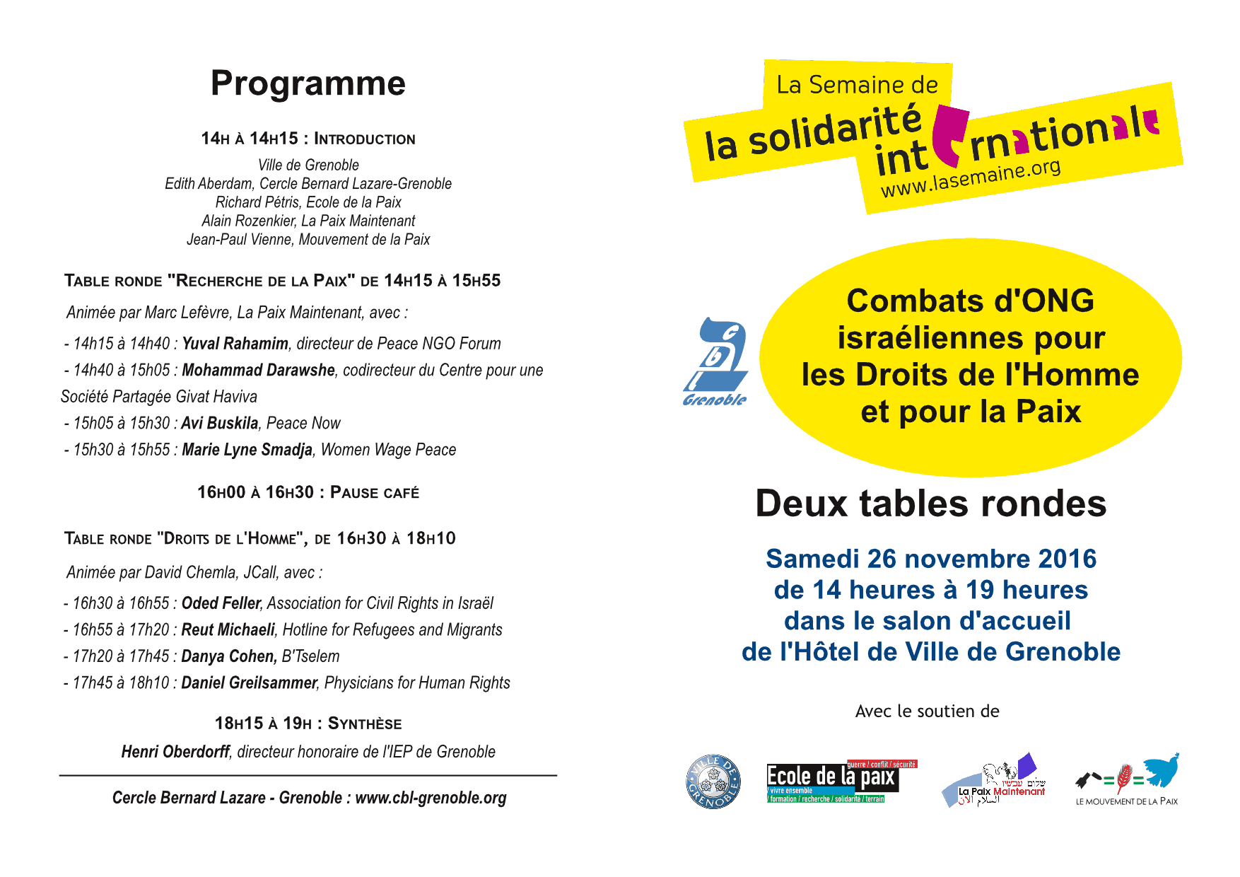 Cercle Bernard Lazare-Grenoble, avec le soutien de la Ville de Grenoble, l'Ecole de la Paix, La Paix Maintenant, le Mouvement de la Paix - Isère