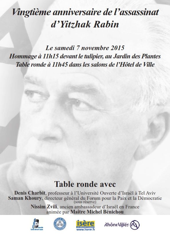 Le samedi 7 novembre 2015 - Hommage à Rabin à 11 h 15 devant le tulipier planté à sa mémoire au Jardin des Plantes, - puis table ronde à 11 h 45 dans les Salons de l'Hôtel de Ville avec Denis Charbit, Saman Khoury et Nissim Zvili